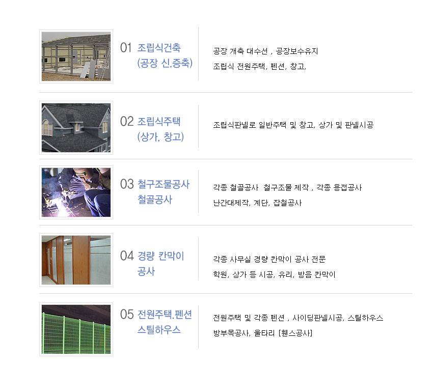 조립식주택. 조립식공장. 판넬공사. 칸막이공사. 조립식창고. 전원주택. 스틸하우스. 철구조물. 철골공사. H빔공사